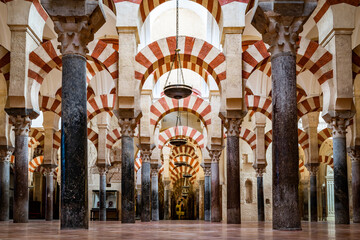 The red and white stone Arches of Mezquita de Cordoba (Great Mosque) (Cordoba Cathedral), Cordoba, Andalusia, Spain