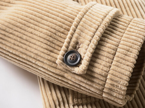 Close-up of a beige ribbed corduroy fabric with a black button on a sleeve.