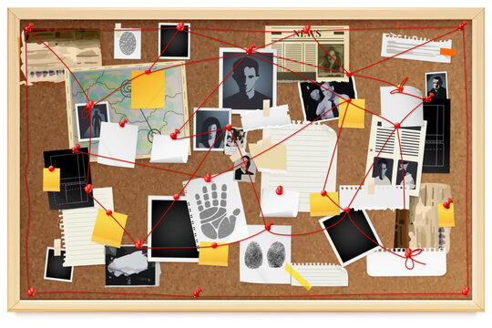 Realistic detective board. True crime investigate, corkboard with pin red threads string on wall criminal police clues evidence spy pinboard paper notes, exact vector illustration