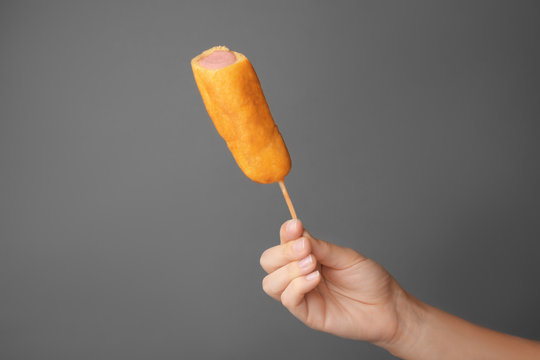 Corn dog traditional American street food deep fried hotdog meat sausage snack treat on stick unhealthy eating on dark wooden background table
