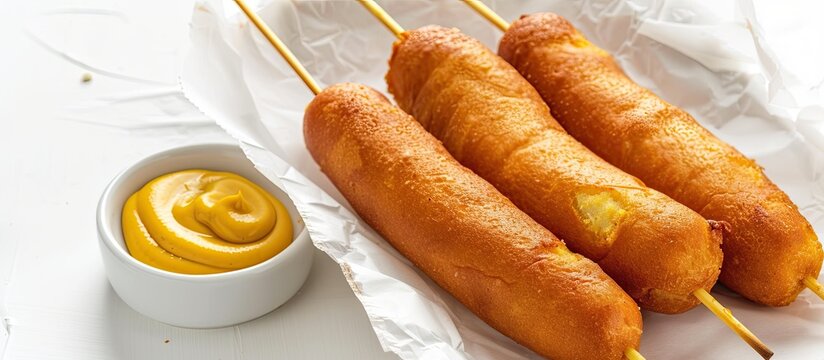 Traditional American fast food concept depicted with homemade corn dogs accompanied by mustard on a simple white background, ideal for copy space image.