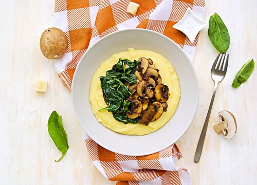 A serving of polenta or corn grits topped with sautéed mushrooms and spinach on a gray dish against a light concrete backdrop Italian recipes