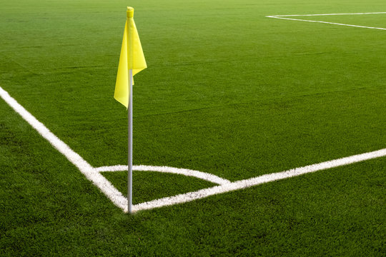 Yellow flag on the corner of a football field. White line marking sports field for football players. Place for a corner kick on a soccer ball.