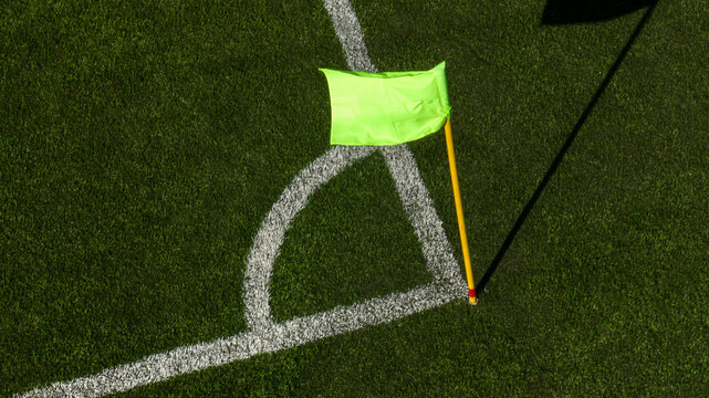 Close up of the corner flag of a football pitch with artificial grass.