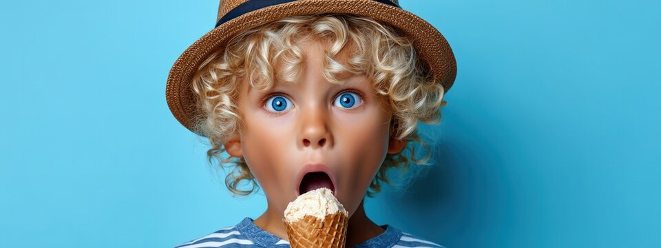 Un jeune garçon heureux et surpris aux yeux bleus et aux cheveux blonds bouclés portant un chapeau, léchant un cornet de glace sur un fond bleu pastel isolé, vue panoramique.