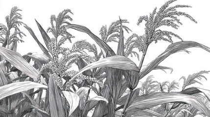 Detailed black-and-white drawing of corn stalks against a bright white sky