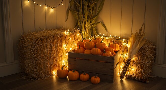 Fall scene crate of pumpkins hay bales corn stalks fairy lights