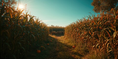 Tall corn stalks form a winding maze for outdoor activity, autumn event, harvest celebration