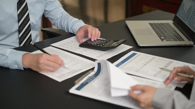 corporate, finance, budgeting, accounting, document, revenue, expenses, profit, audit, strategy, Person using calculator and reviewing financial documents for accounting and budget planning.