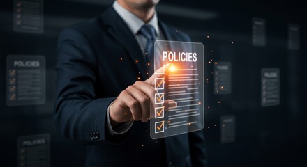Businessman pointing at a digital policies document with checked boxes concept