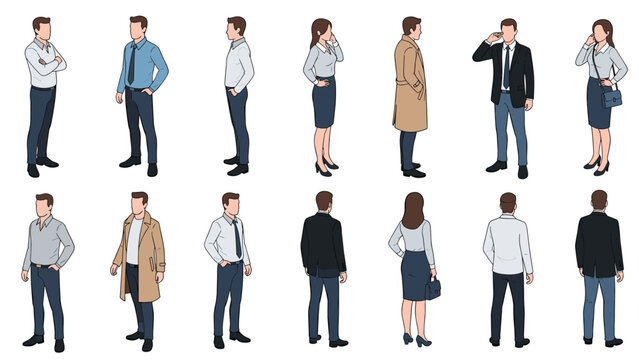 Vector character set showing professional men and women in business casual attire from multiple perspectives including front and back.