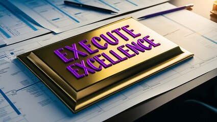 Gold plaque on desk reads "Execute Excellence," signifying achievement and success in business.