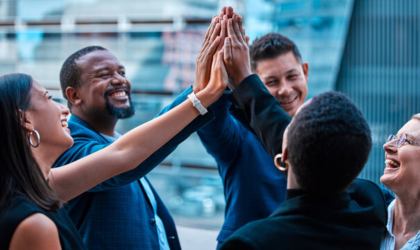 High five, collaboration and motivation with a business team on a balcony together for success or celebration. Teamwork, meeting and wow with a group of corporate people in support of company growth
