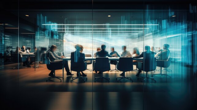 The concept of sustainability in business centers, crowds of business people walking at a corporate office in a green city downtown, abstract motion blur image with blurred background, generative AI