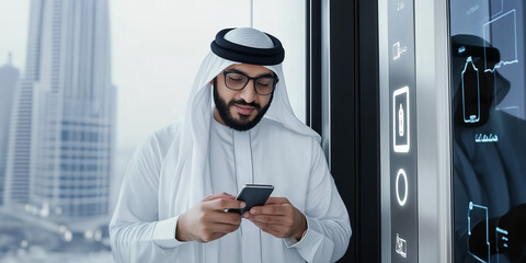 Arab businessman using smartphone in modern office building with futuristic elevator