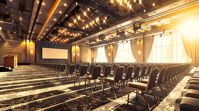 Conference Hall Interior: An empty conference hall with chairs and a presentation screen, creating a professional and organized space for events