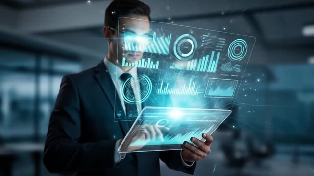 Futuristic Business Intelligence Analyst Interacting with a Glowing Holographic Data Dashboard on a Transparent Tablet.