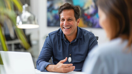 Smiling businessman in suit having meeting with colleague in modern office, professional corporate communication, leadership concept
