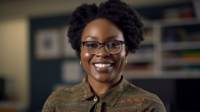 A confident Black businesswoman smiles warmly during a successful team meeting, radiating positivity and collaboration in a bright modern office.