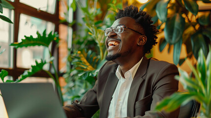 A cheerful businessman working on a laptop surrounded by plants in a modern office with abundant natural light