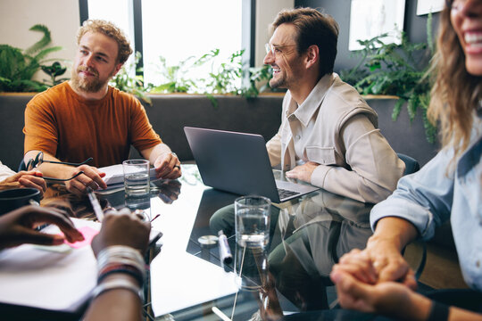 Smiling businesspeople talking during a meeting with coworkers