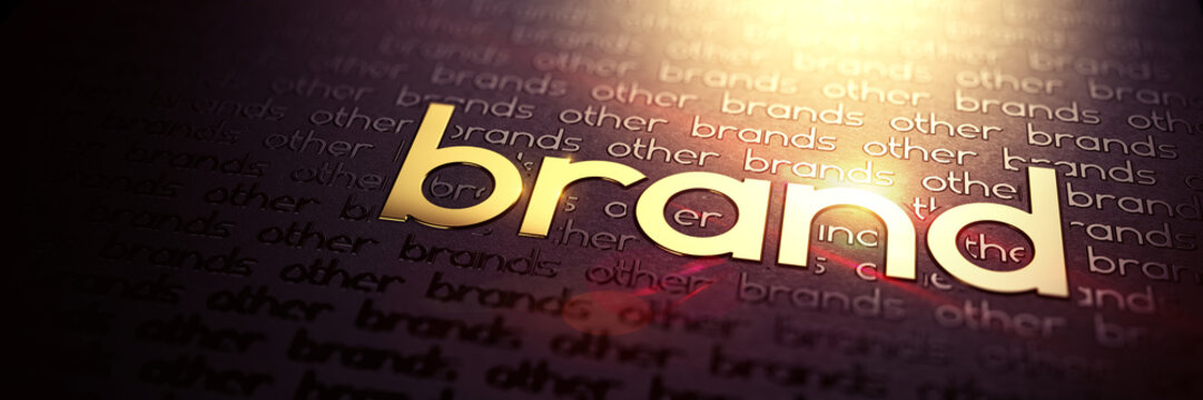 BRAND - Macro Photo of Gold Slogan. Golden Word Brand Embossed on Dark Paper. Great Business Concept with Warm Dramatic Lighting and Light Artifacts. 3D Remder.