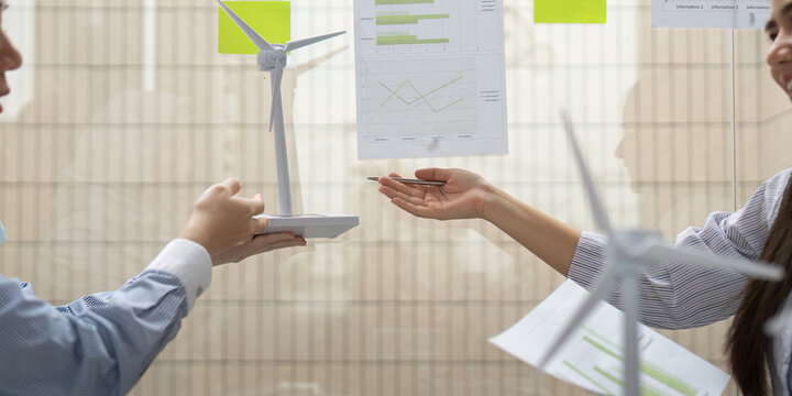 Renewable Energy Collaboration. Professionals discussing wind energy projects and sustainability metrics in a corporate environment.