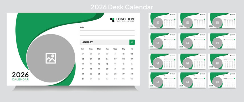 Trendy desk calendar 2026 template, corporate desk calendar schedule 2026 monthly 12-page planner layout, editable vector eps 10 file format
