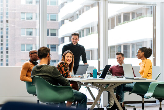 Coworkers having meeting in conference room