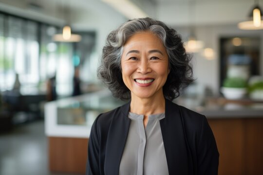 A smiling, happy, and confident Latino old mature professional business woman, a corporate leader and senior middle-aged female executive, stands in her office with arms crossed, gazing at the camera