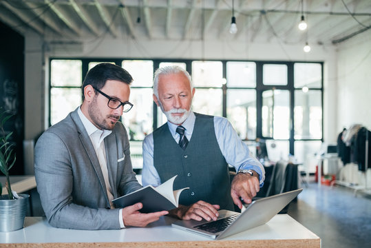 Focused senior and young colleagues discussing project.
