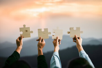 Concept of business people working as a team, cooperation within an organization, hands holding a jigsaw puzzle above their heads with a background of mountains with sunlight shining down.