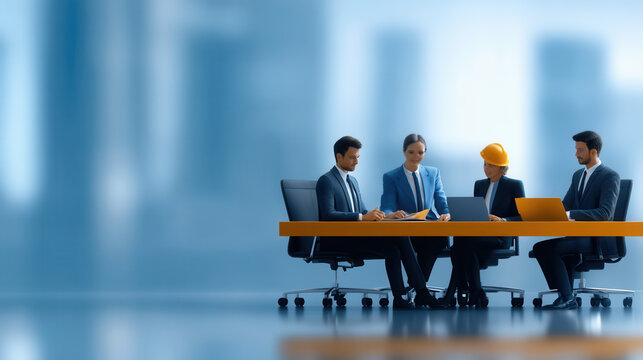 Isometric view of construction workers in safety vests meeting around a table in a modern office setting