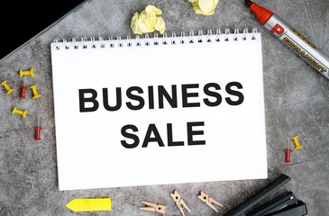 Business sale text on a white notebook with pins, marker and stapler on a concrete table