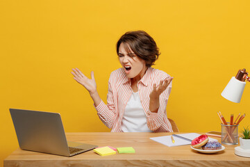 Young mad angry wondered employee IT business woman in casual shirt sit work at office desk using laptop pc computer spread hands isolated on plain yellow color background Achievement career concept