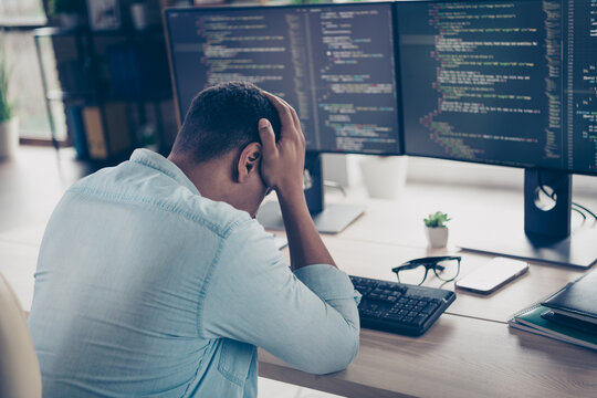 Photo of sadness upset young guy found his failed program code dont know solution app bug depressed devops at workstation home office