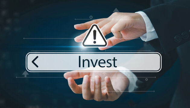 Symbolic 3D concept of corporate danger with businessman on suspended plank between skyscrapers surrounded by warning icons and financial arrows highlighting risk management and economic instability
