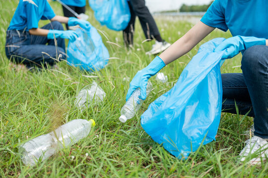Happy volunteer people group charity with garbage bags cleaning up in park. Corporate social responsibility and society activity for Environment . Ecology and CSR concept.