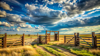 Rustic wooden corral gates with weathered brick posts stand tall on a sprawling prairie ranch landscape under a vast open blue sky with wispy clouds.
