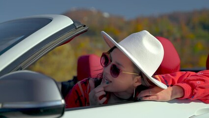 Sexy woman looking car mirror checking makeup closeup. Girl correcting hairstyle