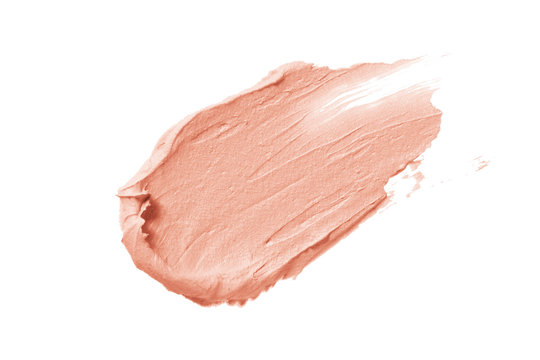 Color corrector stroke isolated on white background. Peach color correcting cream concealer smudge smear swatch sample. Makeup base foundation creamy texture