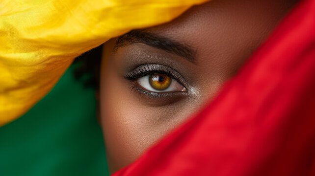 Creative African-American woman face fashion portrait. Young woman eye with red yellow green flag colors background. Black History Month, racial equality, freedom, human rights day concept