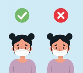 How to wear a medical mask correctly. Examples of use on a woman's face. Wrong with the sign of the cross