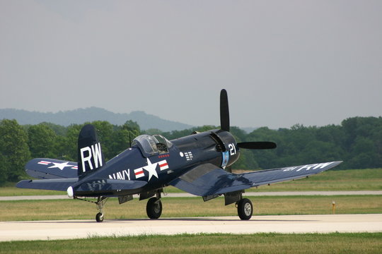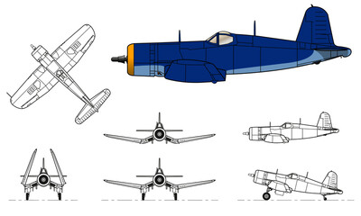 Vought F4U Corsair WWII fighter aircraft. Vector illustration in black and white line drawing. Color side profile.