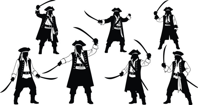 Pirate silhouettes set, a vector illustration collection of buccaneers, corsair figures with swords, isolated fighting stances, Caribbean character icons.