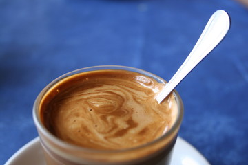 Small shot of espresso latte cortado at a Hawaiian Kona cafe