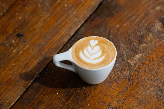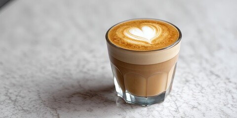 Mug of cortado served on table in cafe. Traditional Spanish coffee.