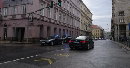 Police and black cars with flashing lights drive down the street. A cortege or escort of an important person. Government workers