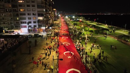 People carrying the Turkish flag for the national holiday celebration in Izmir - 4K video of the large Turkish flag and people carrying it, taken by drone, Izmir-Turkey and the celebration cortege