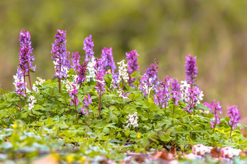Scenic magical spring forest background of violet and white hollowroot Corydalis cava early spring wild flowers in bloom.